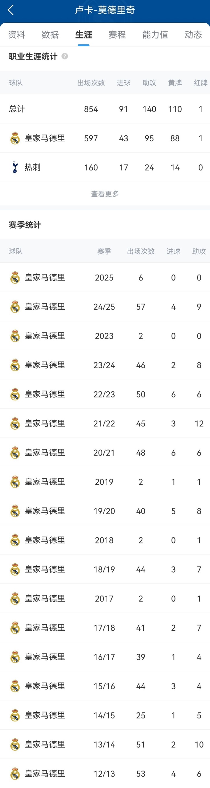 莫德里克(Modric)于2012年加入了皇家馬德里(Real Madrid)。他在13年內(nèi)進(jìn)行了597場(chǎng)比賽,打進(jìn)43球并協(xié)助95次比賽,幫助球隊(duì)贏得28冠軍獎(jiǎng)杯:6個(gè)冠軍聯(lián)賽,6個(gè)俱樂(lè)部世界杯,5個(gè)歐洲超級(jí)杯,4個(gè)La Liga,2杯杯,2杯德?tīng)枴ぐ枴だ滓梁?個(gè)西班牙超級(jí)杯。